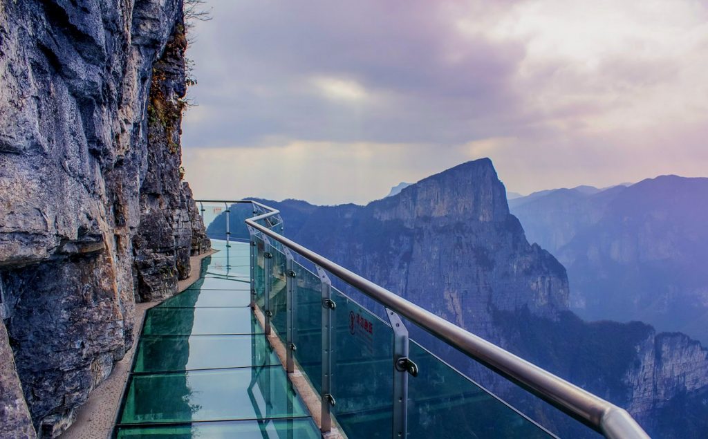 Tianmen Mountain — Zhangjiajie, China – munții Tianmen oferă peisaje care-ți taie răsuflarea, dar dacă vrei o aventură pe cinste, fii atent la „Stairway to Heaven”, sau Scara către Rai pe românește. Discutăm despre 99 de trepte din sticlă pe care doar cei cu adevărat curajoși le pot încerca. Este de departe una dintre cele mai tari aventuri cu platforme din sticlă din lume.