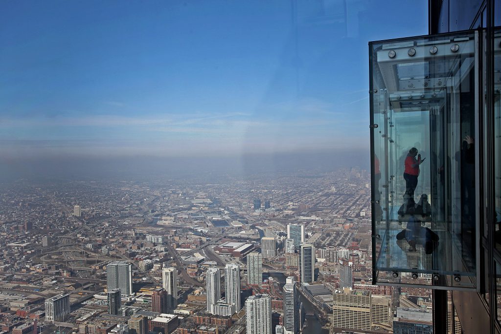 Willis Tower — Chicago, Illinois, SUA – discutăm despre cea mai înaltă clădire din Chicago, cel de-al doilea cel mai înalt zgârie-nor din SUA. La etajul 103 arhitecții au creat de departe cea mai tare terasă din sticlă din lume, la 412.4 metri înălțime. De departe cea mai tare experiență de acest gen din lume. Nu mulți sunt cei care ar putea să facă față unei asemenea provocări.